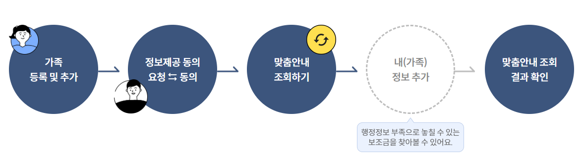 14세 이상인 가족 구성원이 사전 동의 후 가족 맞춤안내 조회하면 한집에 살고 있는 가족(동일세대) 뿐만 아니라 함께 살지 않는 가족(분리세대)의 보조금도 찾을 수 있어요.