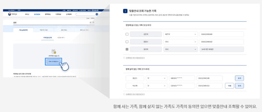 가족 구성하고 가족 맞춤안내 조회하면 한집에 살고 있는 가족(동일세대) 뿐만 아니라 함께 살지 않는 가족(분리세대)의 보조금도 찾을 수 있어요.