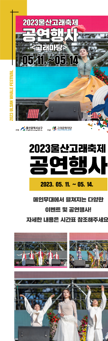 2023년 울산고래축제는 국내 고래테마공원 1호인 장생포고래문화마을과 고래문화특구인 장생포 일원에서 고래를 테마로 하는 고래퍼레이드, 수상 퍼포먼스, 뮤지컬 및 다양한 공연, 장생포 밤바다 장생포차, 미디어아트 빛의 공원, 부대행사 등 다채로운 즐길거리를 선사한다고 합니다.