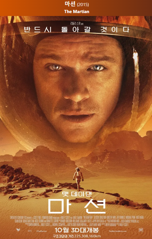 | 영화 리뷰: <마션> (The Martian, 2015) (1) | 2025.03.17 |