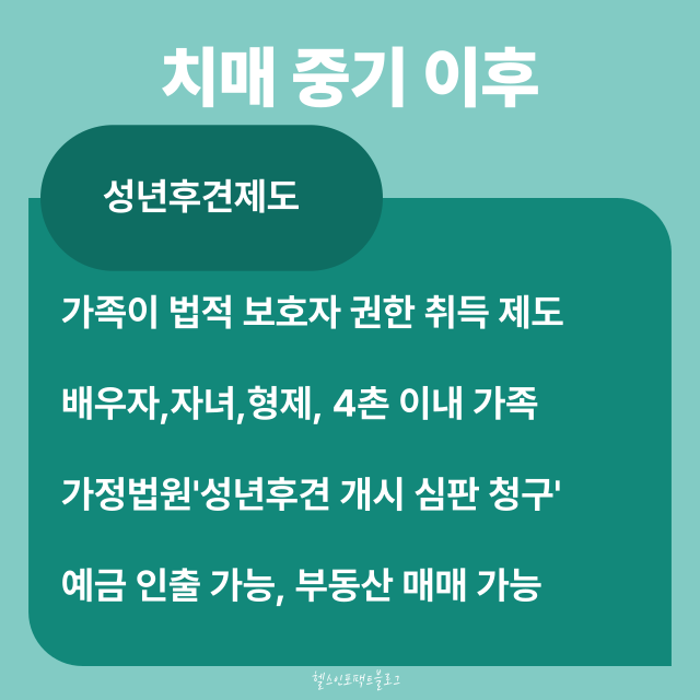 | 치매 중기 이후 | 성년후견인 신청 | 법원 절차 필요 |