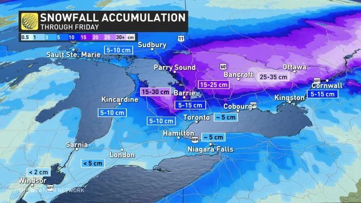 온타리오 중부와 남부 일부 지역은 실제로 이 시스템과 관련된 폭설과 비의 영향을 견딜 것이라는 높은 신뢰가 있다.