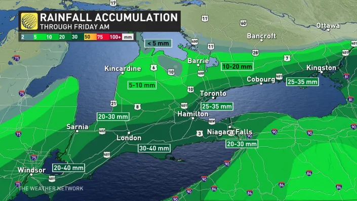 이리호와 온타리오호 북쪽 지역은 목요일과 금요일 아침 사이에 20-40mm의 비가 내리겠고, 눈만 내리는 중부 지역에 도달할 때까지 북쪽으로 양이 급격히 줄어들 것이다.
