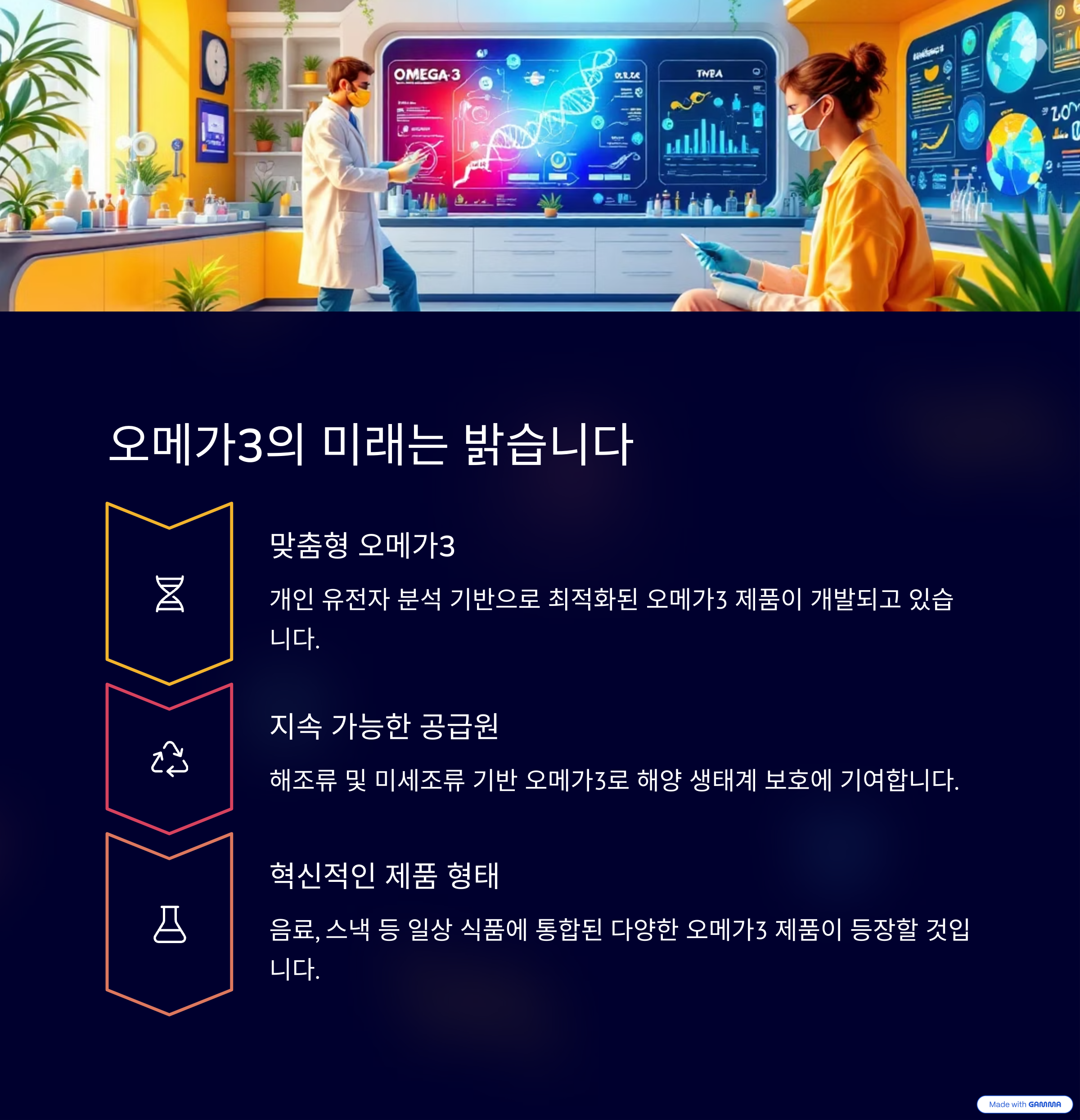 오메가3는 앞으로도 건강 산업에서 핵심적인 역할을 지속할 것으로 예상됩니다. 특히, 맞춤형 영양 솔루션이 각광받는 가운데, 개인의 유전자 정보나 건강 상태에 따라 최적화된 오메가3 복합제가 개발되고 있습니다.