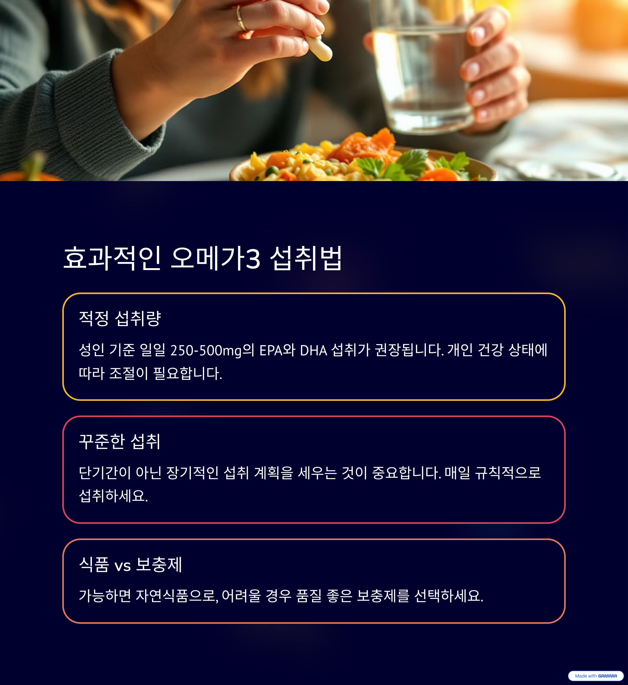 오메가3의 효과를 극대화하기 위해서는 적절한 용량과 꾸준한 섭취가 중요합니다. 성인의 경우, 하루 500~1000mg의 EPA 및 DHA 섭취가 권장되며, 식사 후 섭취하는 것이 흡수율을 높이는 데 도움이 됩니다.