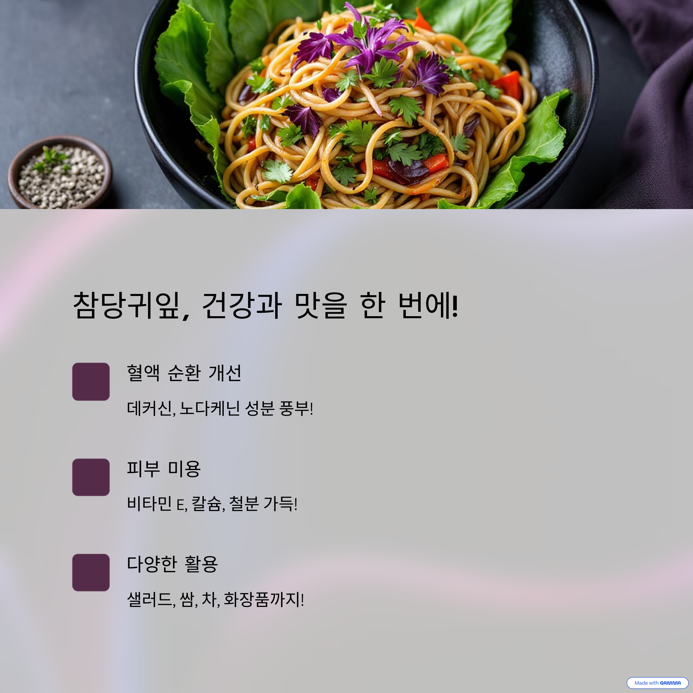 참당귀잎은 다양한 건강 효능으로 유명합니다. 항산화 성분인 플라보노이드와 쿠마린을 풍부하게 함유하고 있어 노화 방지, 세포 손상 억제에 도움이 됩니다. 특히 혈액순환 개선에 탁월하여 고혈압이나 심혈관 질환 예방에도 긍정적인 영향을 줍니다.