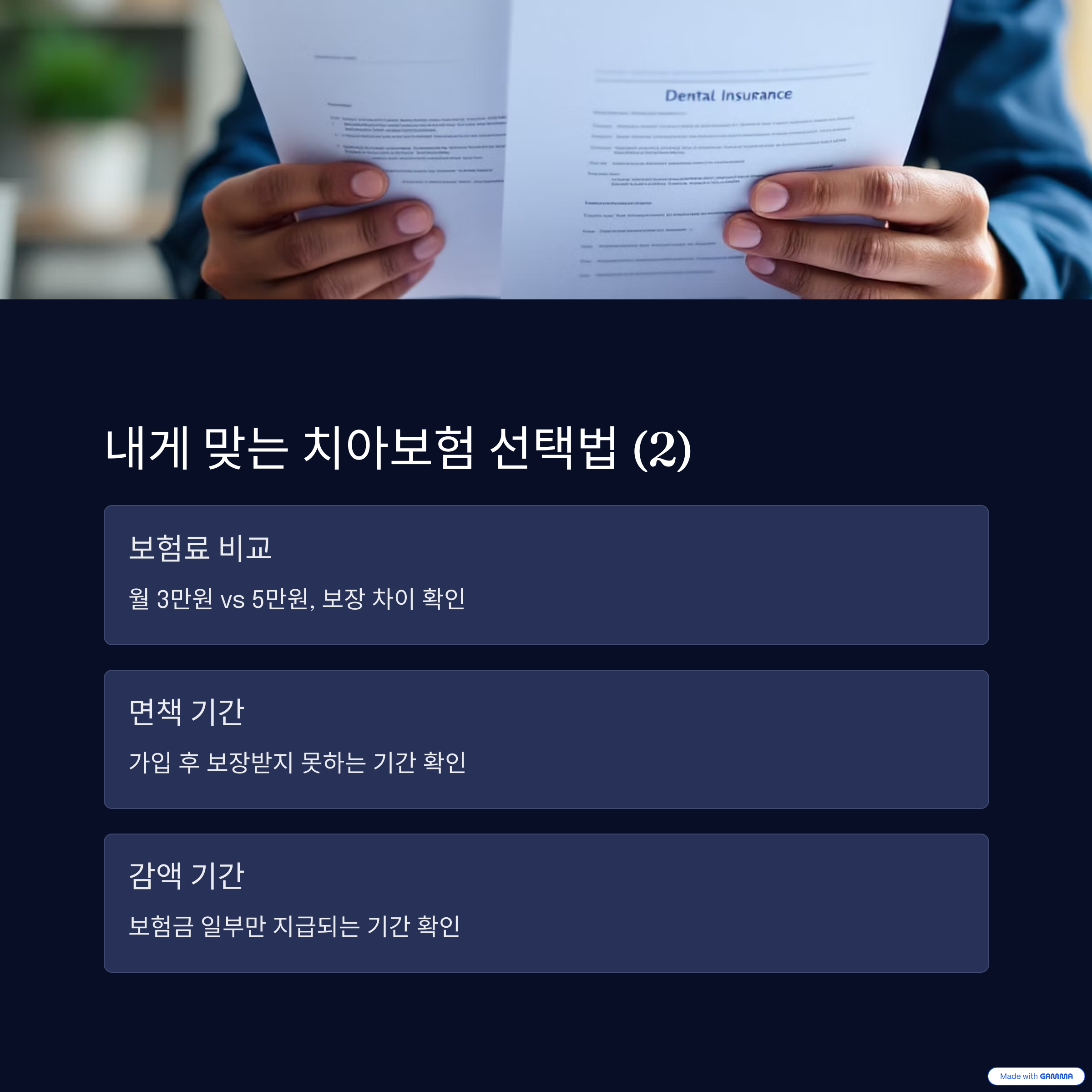 보험 선택 전 반드시 자신의 치아 상태와 필요한 보장 항목을 체크해야 합니다. 그다음 보험료, 보장 범위, 감액 및 면책 기간을 비교해보세요.