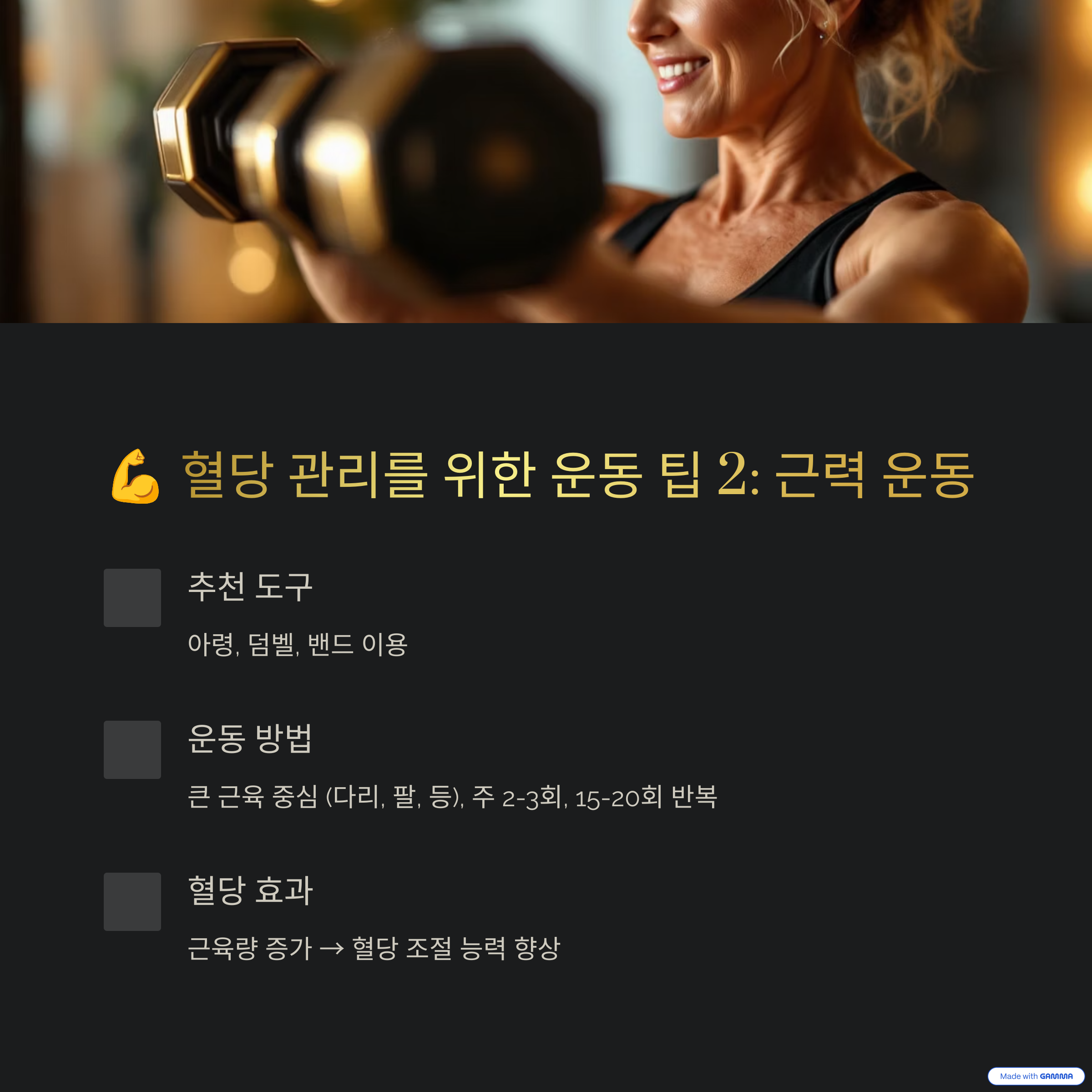 - 근력 운동: 아령, 스쿼트, 플랭크 등 (주 2~3회)
