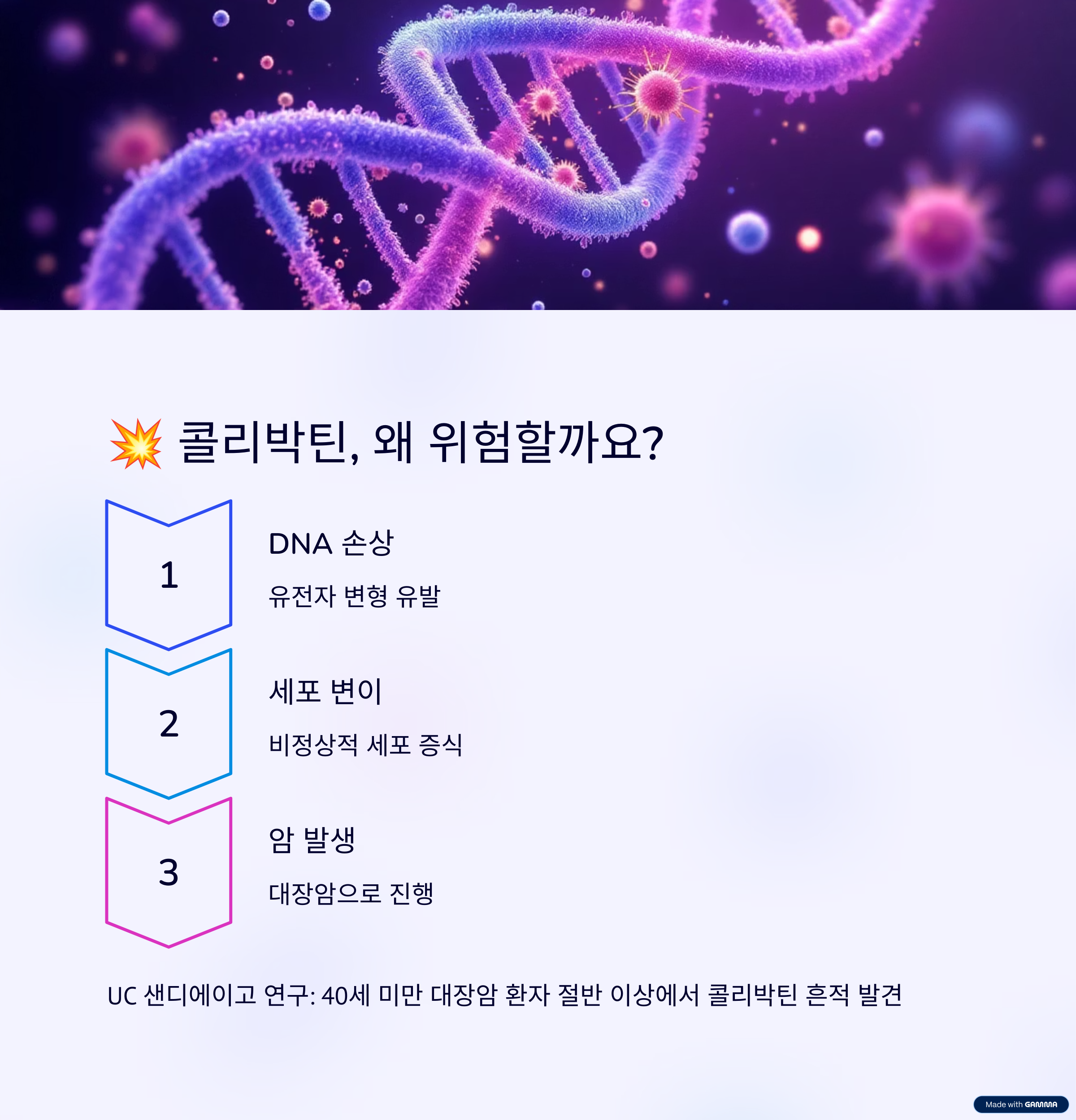 이 독소는 대장 세포의 DNA를 손상시키고, 이를 복구하지 못하면 암으로 발전할 수 있어요.
