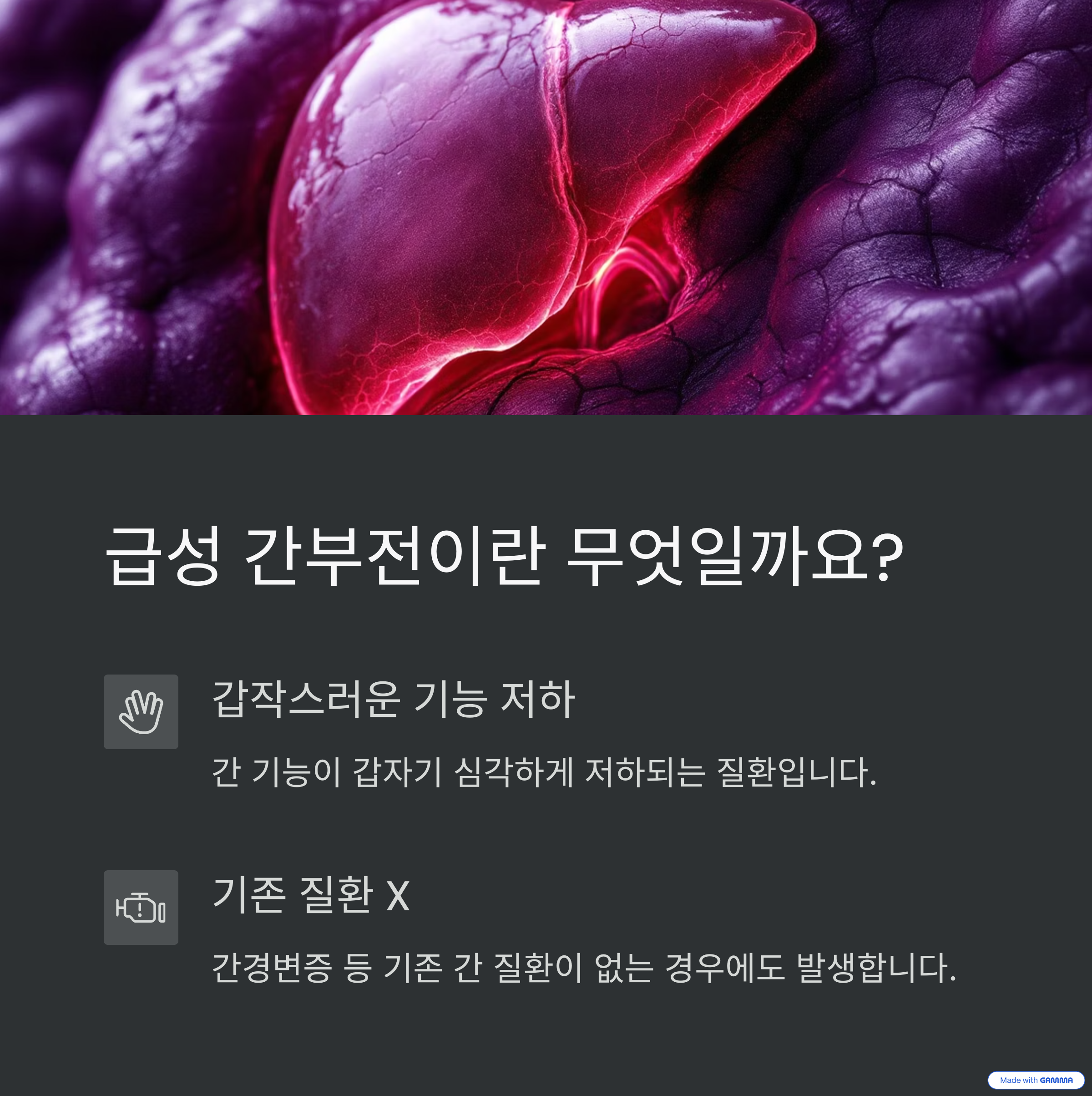 ‘급성 간부전’은 멀쩡하던 간이 갑자기 기능을 잃는 질환으로, 짧게는 수일 내에도 생명을 위협할 수 있습니다. 문제는 초기 증상이 매우 비특이적이어서 위장 질환이나 단순 피로로 오해하기 쉽다는 점입니다.