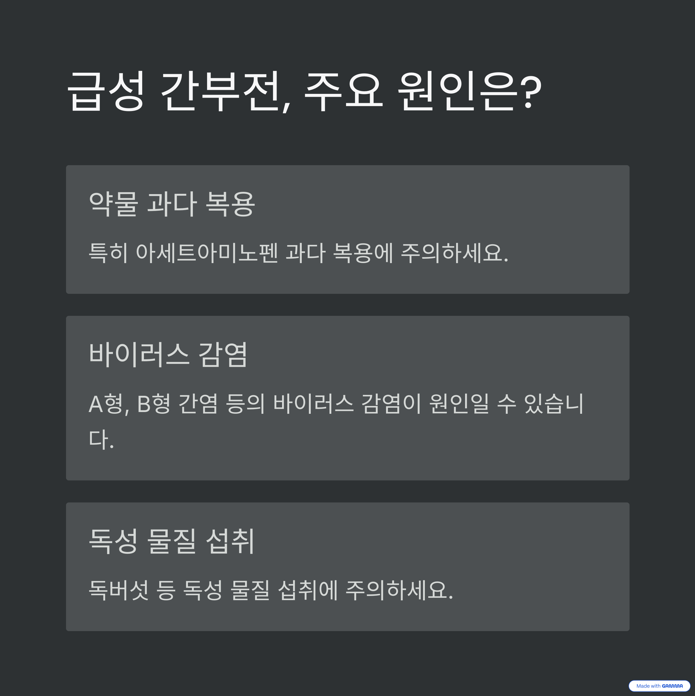 ‘급성 간부전’은 멀쩡하던 간이 갑자기 기능을 잃는 질환으로, 짧게는 수일 내에도 생명을 위협할 수 있습니다. 문제는 초기 증상이 매우 비특이적이어서 위장 질환이나 단순 피로로 오해하기 쉽다는 점입니다.