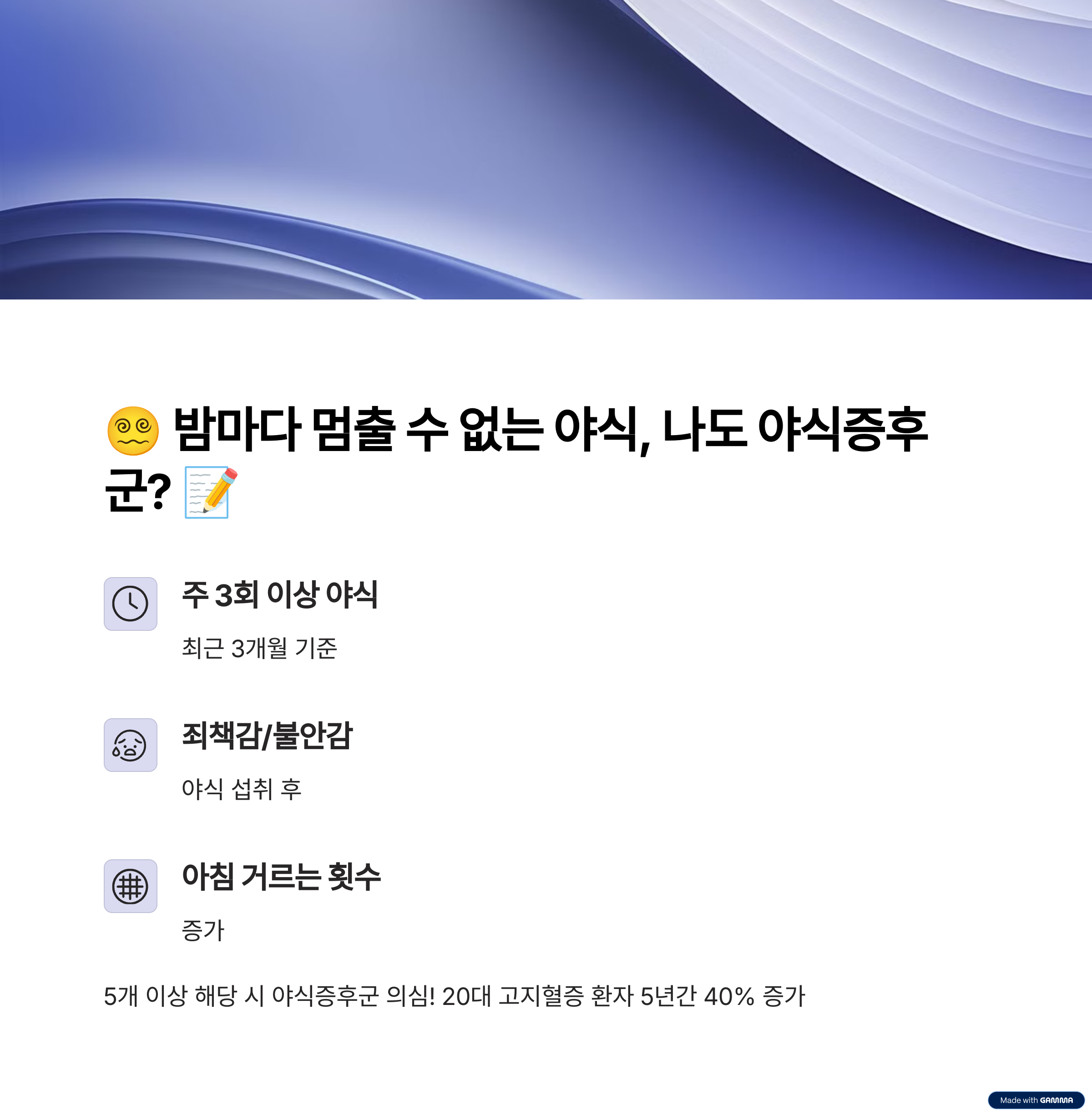 야식증후군은 저녁 이후 하루 섭취량의 절반 이상을 먹는 식습관을 의미해요. 밤에 폭식이 반복되면 수면의 질이 떨어지고, 체중 증가와 함께 고지혈증, 역류성 식도염, 우울증까지 유발될 수 있습니다.