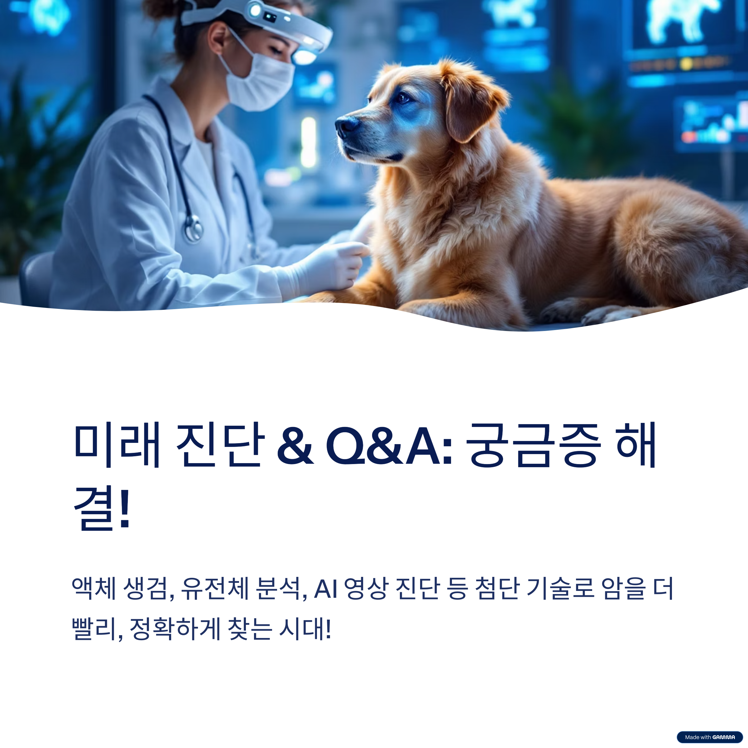 AI 기반 영상 분석과 유전자 분석 플랫폼도 상용화되고 있으며, 기존의 조직검사보다 침습적이지 않으면서도 높은 정확도를 자랑합니다. 국내에서는 일부 대형 동물병원을 중심으로 시범 도입 중이며, 향후 더 많은 보호자들이 이 기술의 혜택을 받을 수 있을 것으로 기대됩니다.