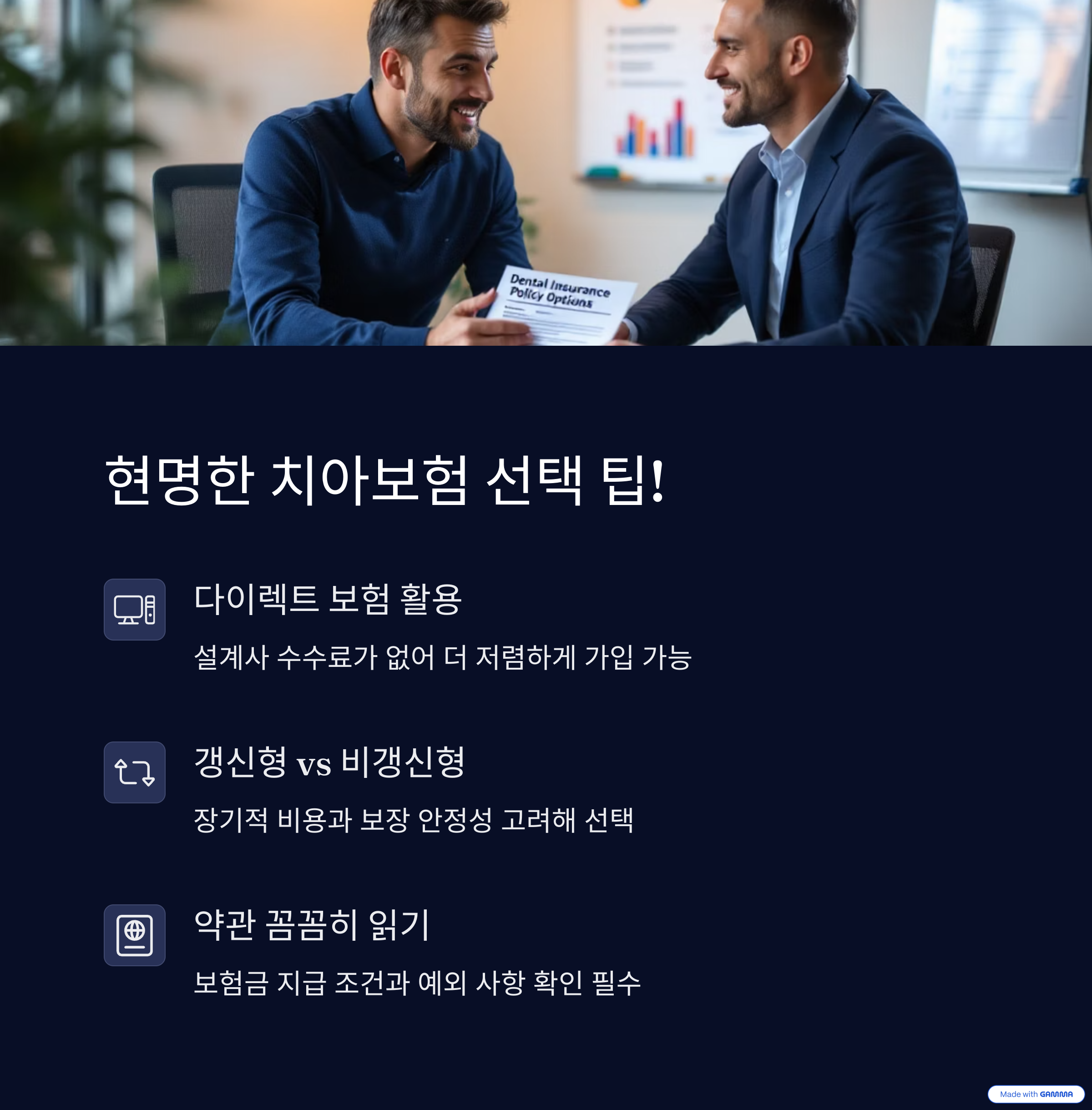 보험 선택 전 반드시 자신의 치아 상태와 필요한 보장 항목을 체크해야 합니다. 그다음 보험료, 보장 범위, 감액 및 면책 기간을 비교해보세요.